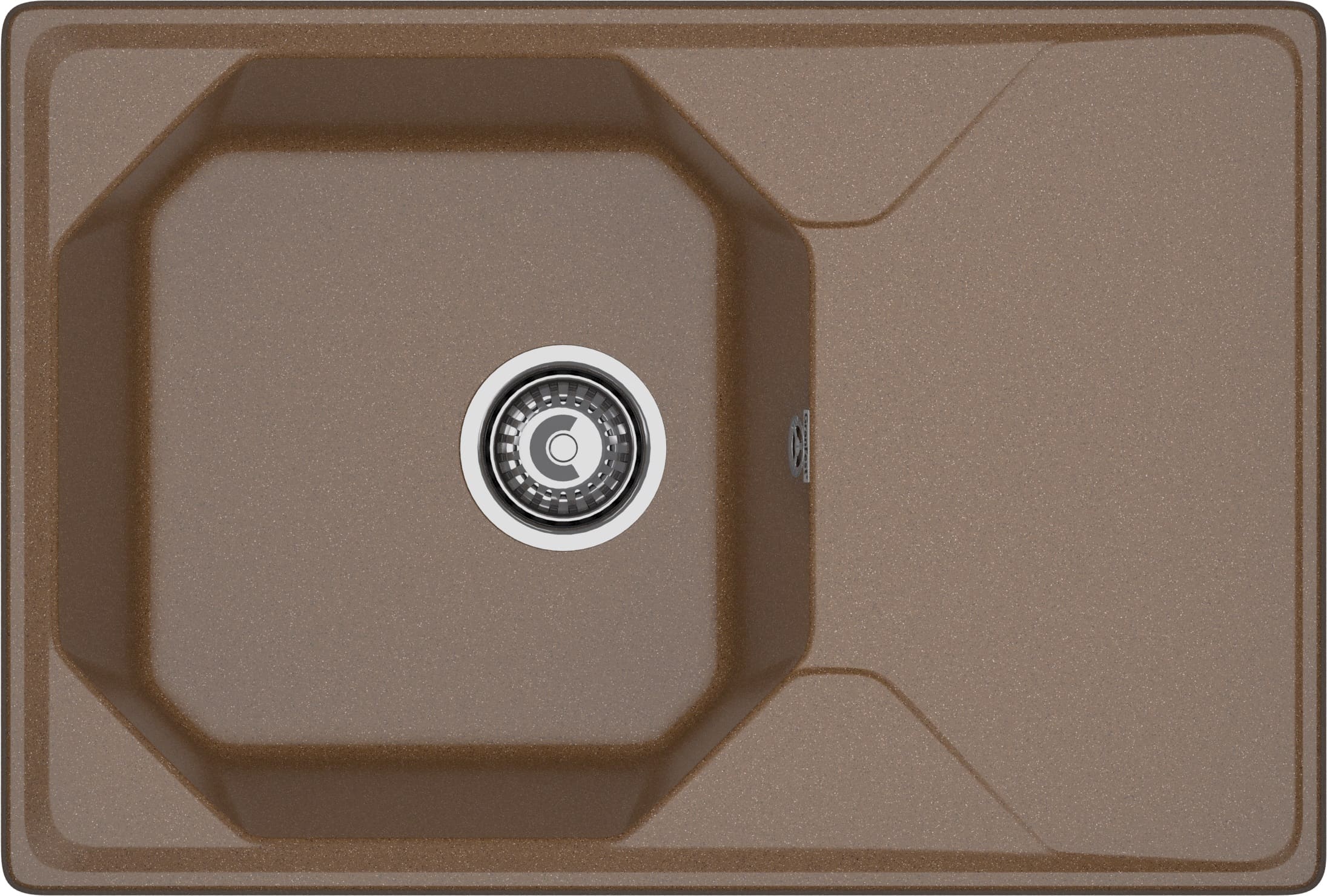 Кухонная мойка врезная из искусственного мрамора, прямоугольной формы, отверстие под смеситель отсутствует, размер чаши составляет 435*435*200, диаметр сливного отверстия составляет 8.89 см. В комплектацию входит: мойка, сливная арматура, паспорт.