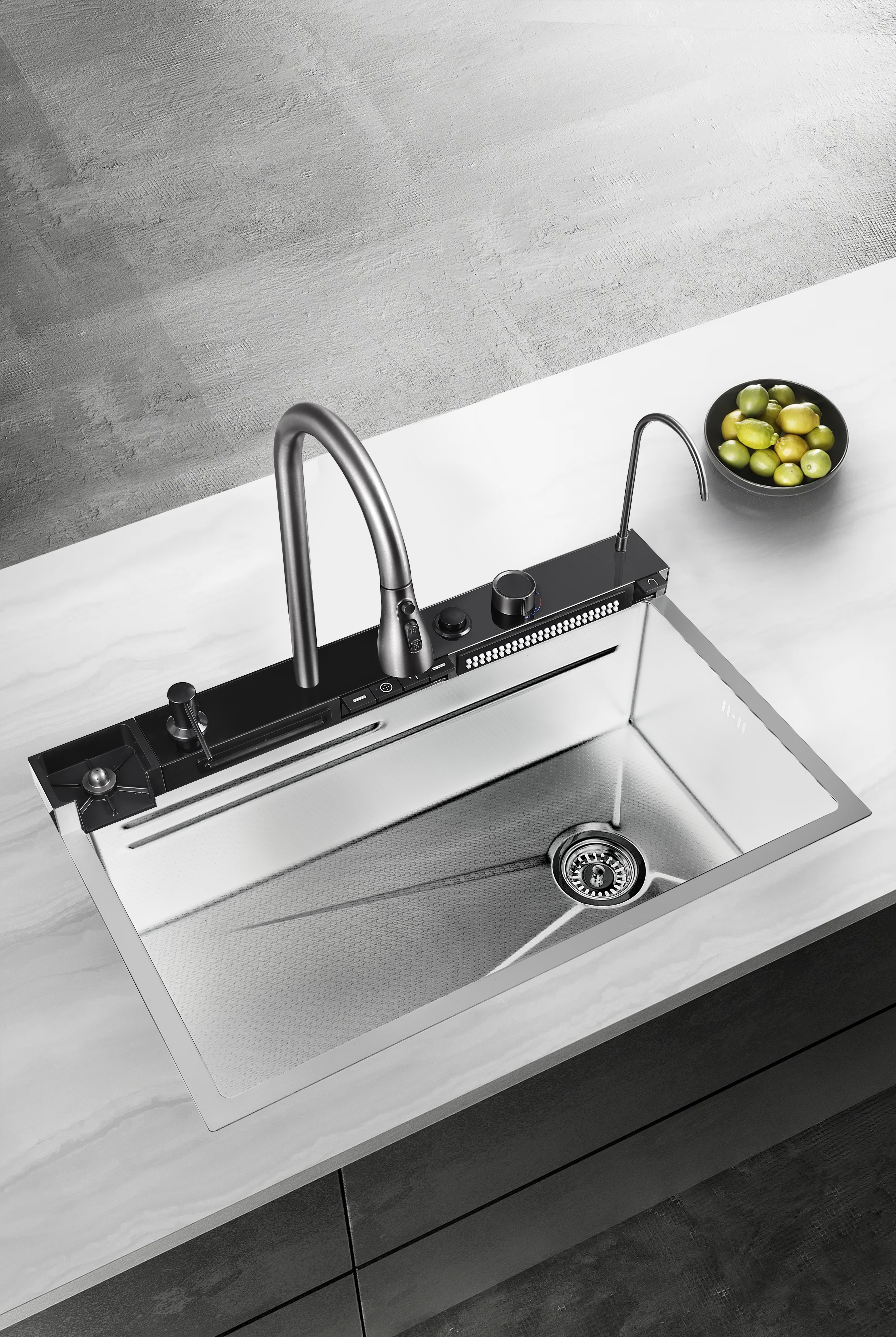 Мойка: материал нержавеющая сталь 1 мм, поверхность матовая, цвет нержавеющая сталь. Панель-смеситель, цвет черный. Функции: фронтальный душ, водопад, встроенный кран для питьевой воды, индикация температуры и времени работы, амбиентная подстветка. Излив с выдвижной лейкой, 3 режима, цвет графит. Излив для крана питьевой воды. Цвет графит. Выпуск полуавтоматический. Дозатор для моющего средства. Ринзер полуавтоматический (мойка стаканов). Колландер - 2 шт. Доска разделочная. Сифон, гофра. Гибкая подводка для воды и смесителя. Кран угловой - 2 шт.