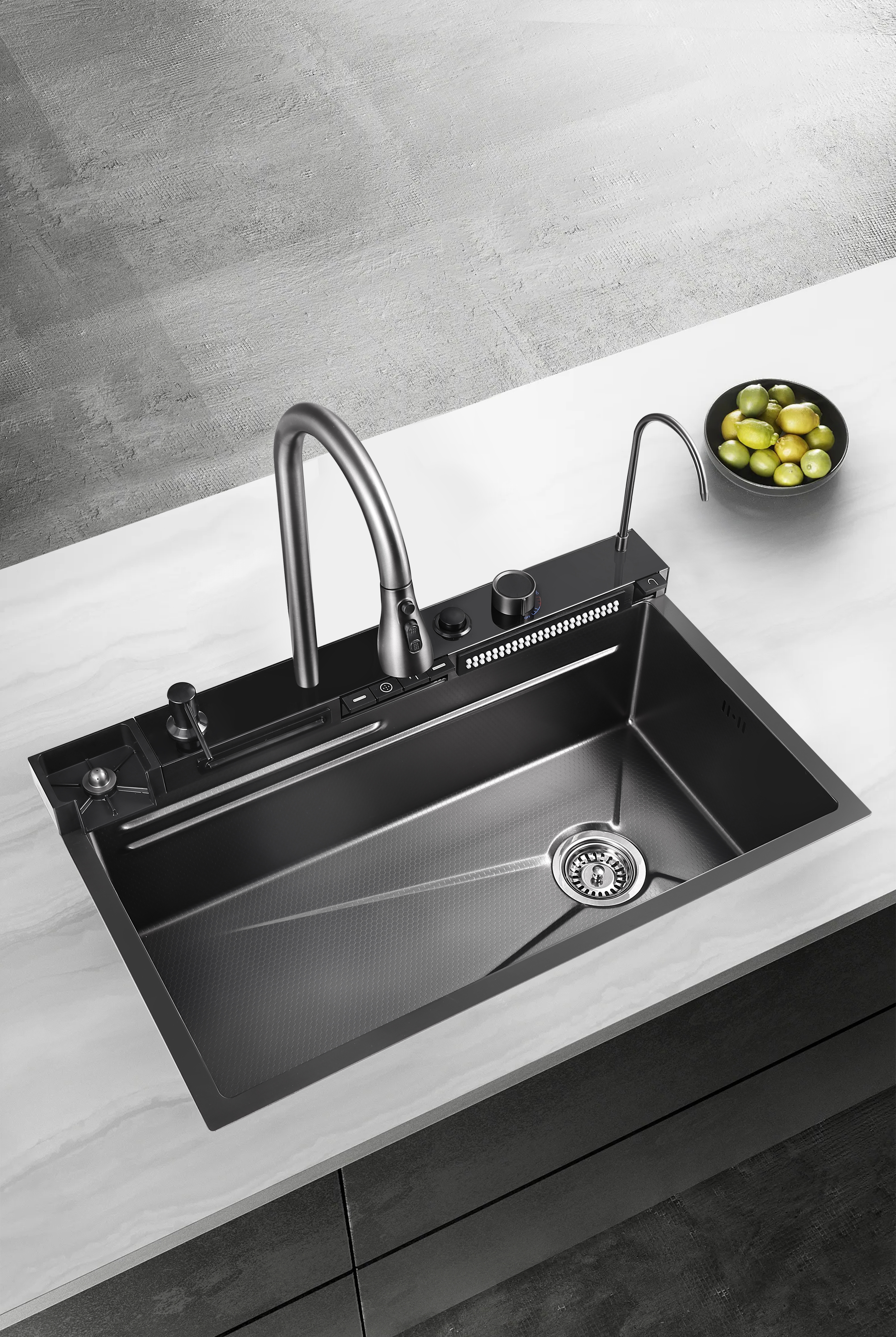 Мойка: материал нержавеющая сталь 1 мм, поверхность матовая, цвет графит. Панель-смеситель, цвет черный. Функции: фронтальный душ, водопад, встроенный кран для питьевой воды, индикация температуры и времени работы, амбиентная подстветка. Излив с выдвижной лейкой, 3 режима, цвет графит. Излив для крана питьевой воды. Цвет графит. Выпуск полуавтоматический. Дозатор для моющего средства. Ринзер полуавтоматический (мойка стаканов). Колландер - 2 шт. Доска разделочная. Сифон, гофра. Гибкая подводка для воды и смесителя. Кран угловой - 2 шт.