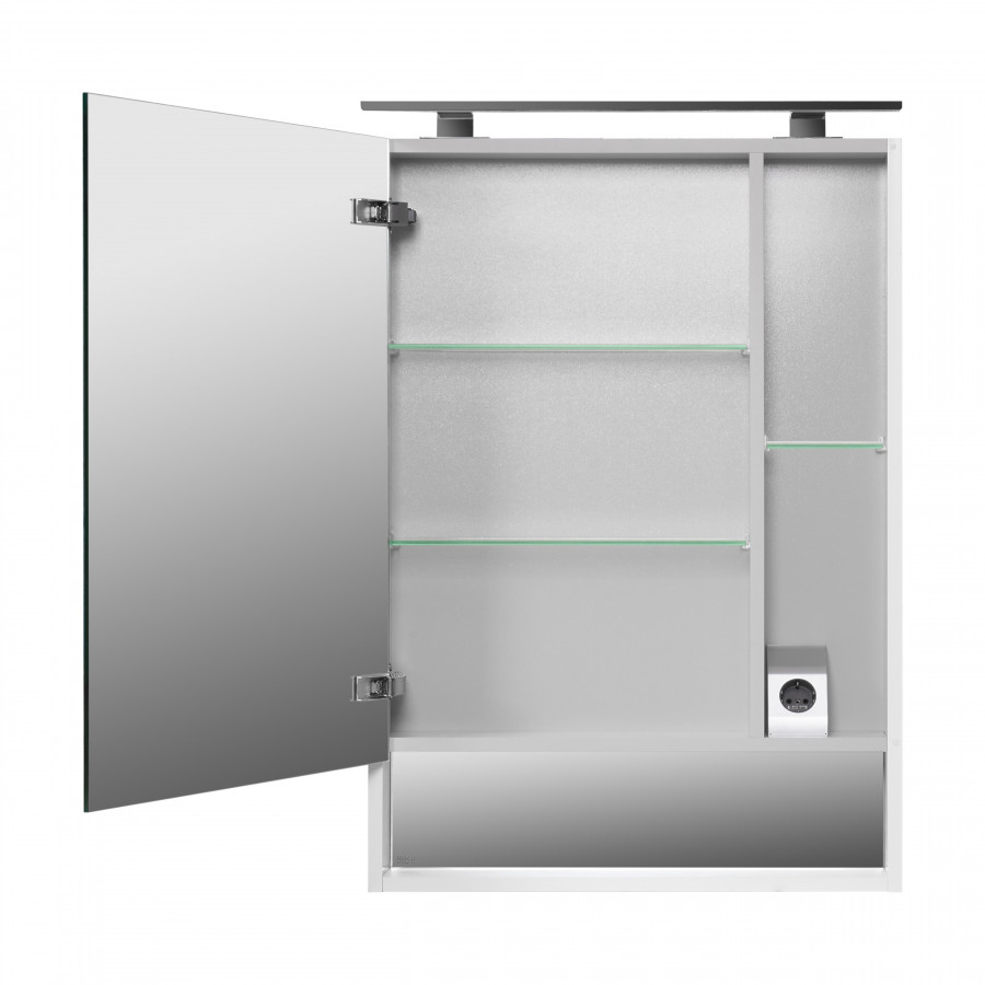 Навесы-2 шт., Зеркальные створки -1 шт, петли с доводом - 2 шт., стеклянные полки - 3 шт., светильник, розетка-1шт