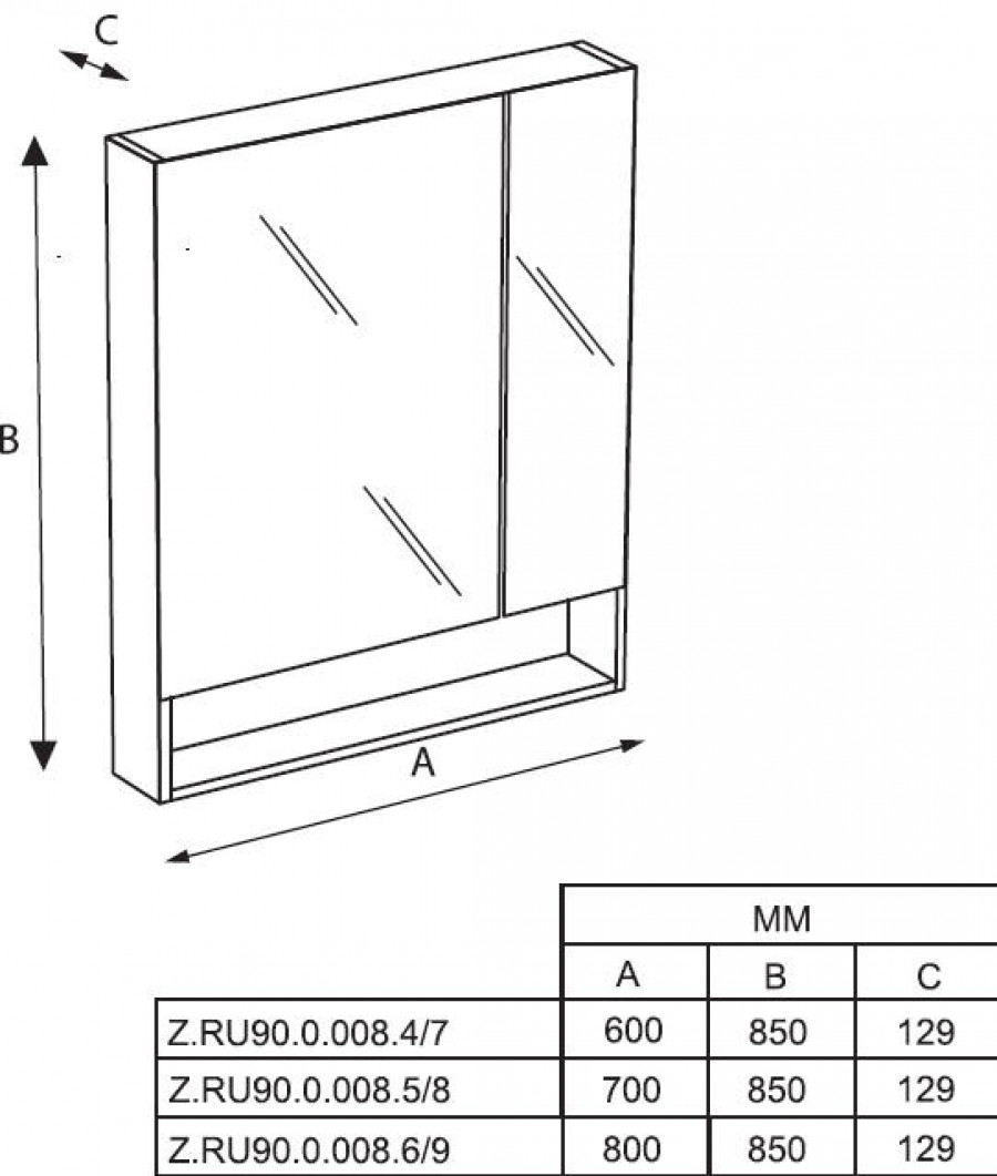 Шкаф зеркальный, навесной, ориентация универсальная, корпус состоит из влагостойкой ЛДСП, с двумя дверцами с петлями доводчиками, с лампами LED.