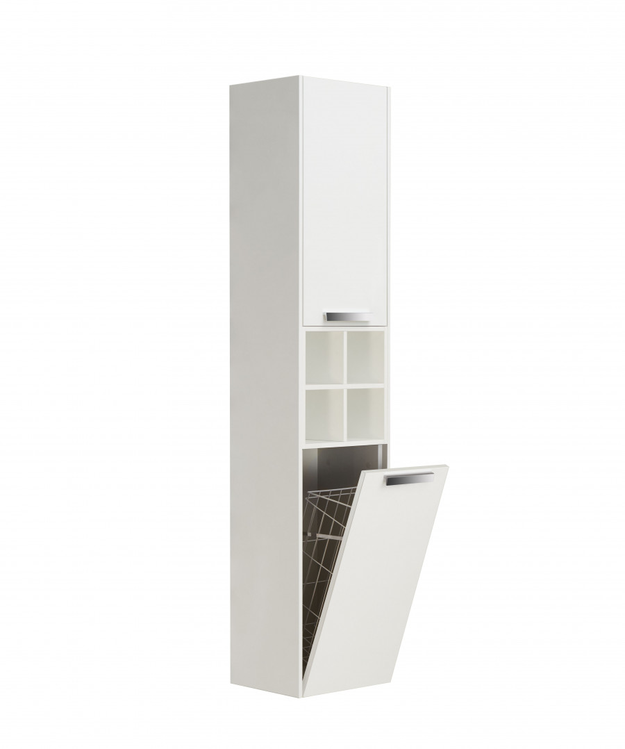 Шкаф-колонна прямоугольной формы из влагостойкой ЛДСП, подвесная, универсальная, с одной дверцей с петлями доводчиками и бельевой корзиной, фурнитура хром.