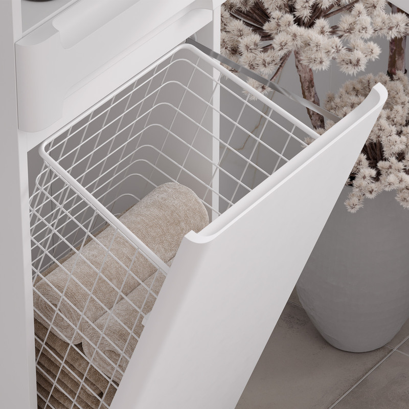 Напольный пенал с двумя стеклянными полками в верхней секции и одной полкой из ЛДСП в нижней секции. Дверки пенала открываются при помощи интегрированных ручек. Петли оснащены доводчиками для плавного закрывания. Фасады пенала изготовлены из МДФ и покрыты матовой эмалью. Корпус изготовлен из влагостойкого ЛДСП. Пенал устанавливается на 4 ножки и фиксируется к стене при помощи креплений.
