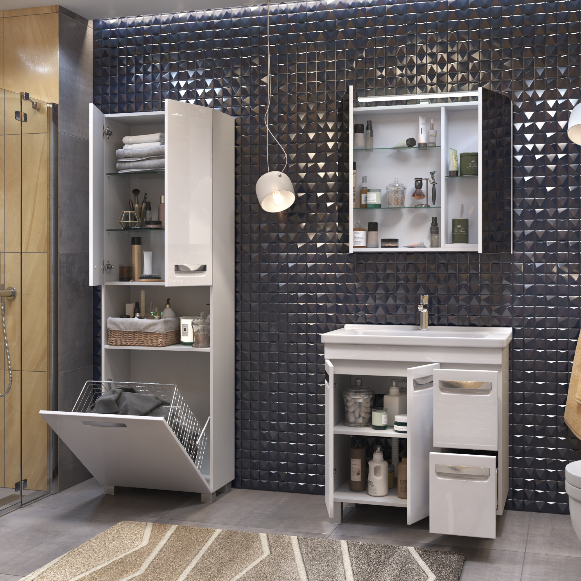 корпус шкафа, 2 дверцы, 1 ящик с бельевой корзиной, петли с механизмом доводчика, 2 полки стеклянные, ручки врезные металлические хромированные, 4 опоры квадратные регулируемые.