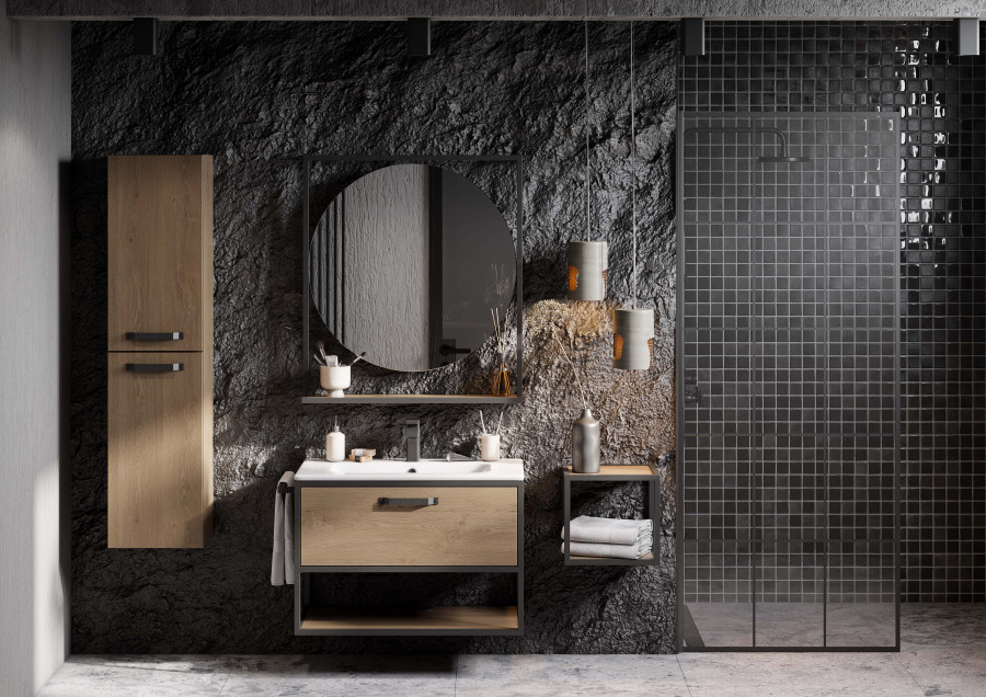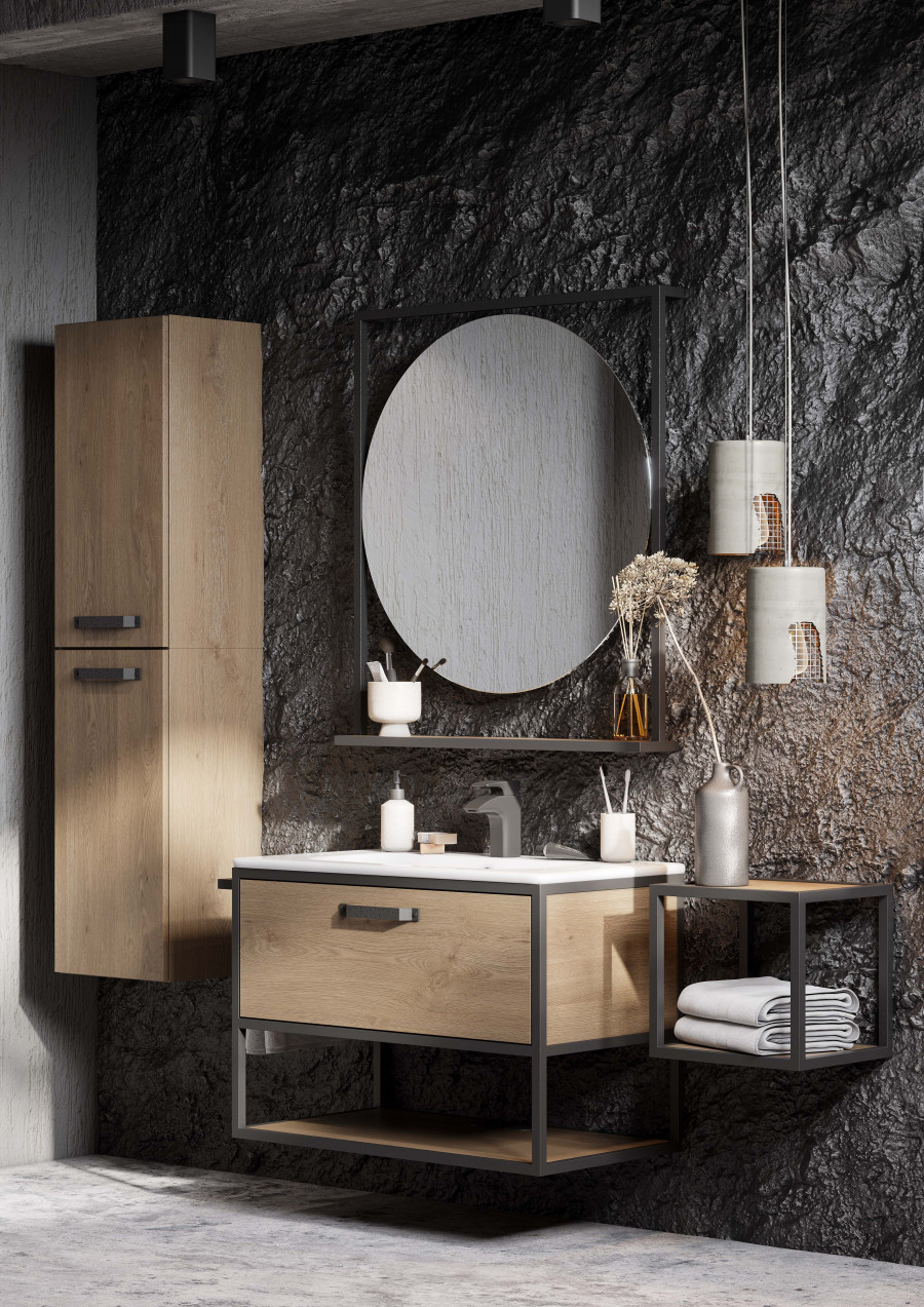 Открытая навесная полка в цвете Дуб Кантри выполнена в форме куба и может использоваться как самостоятельный элемент декора и хранения, а также как дополнение к шкафчику из коллекции Лофт Фабрик. Полка выполнена из черного металлического профиля и влагостойкой ламинированной плиты. Она идеально подойдет для того, чтобы расставить в ванной комнате четкие акценты в дизайне и обеспечить дополнительное место для хранения.