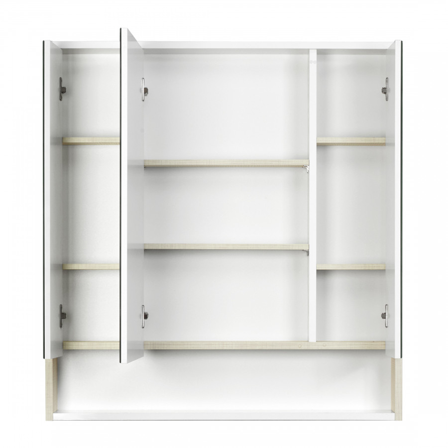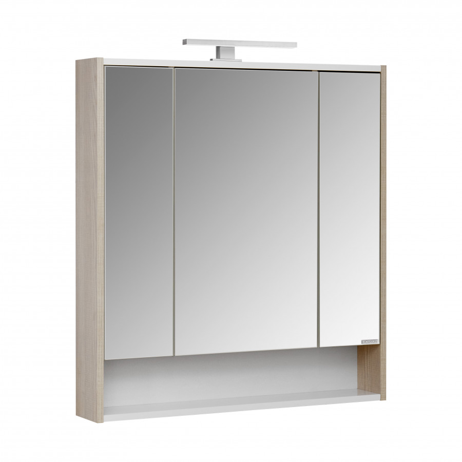 Для тех, кто ценит удобную организацию пространства ванной комнаты, стильным и практичным решением станет компактный зеркальный шкаф Рико 80 от AQUATON в комбинированной отделке. Корпус, в котором сочетаются белый цвет и элегантная текстура под дерево "ясень фабрик", а также распашные фасады с зеркальным покрытием изготовлены из влагостойкой ЛДСП. Шкаф достаточно вместительный и оснащён двумя внутренними полками в каждой из трёх секций. Петли с доводчиком обеспечивают плавное закрывание фасадов-створок. Отсутствие ручек и открытая нижняя полка подчеркивают простой и лаконичный дизайн данной модели.