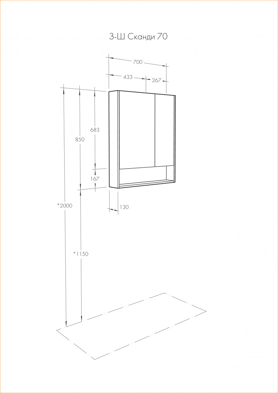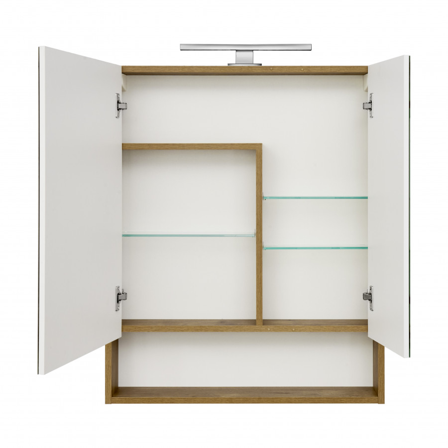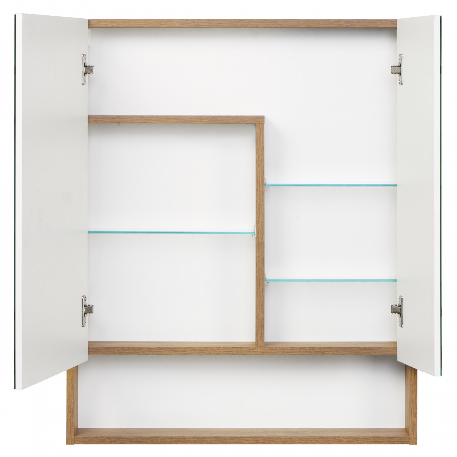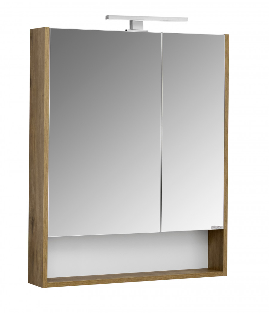 Зеркальный шкаф из ВЛДСП с зеркальным покрытием фасада, прямоугольной формы, монтаж подвесной, ориентация универсальная, включает регулируемые стеклянные полочки за зеркальным фасадом и открытую нишу для косметических средств.