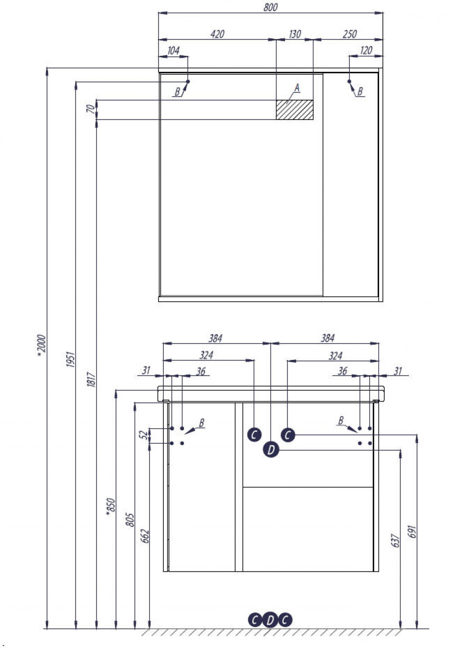 Шкаф- 1 шт., Фасад створка - 1 (петли с интегрированной системой плавного закрывания), регулируемые навесы - 2, полка - 2, LED светильник - 1