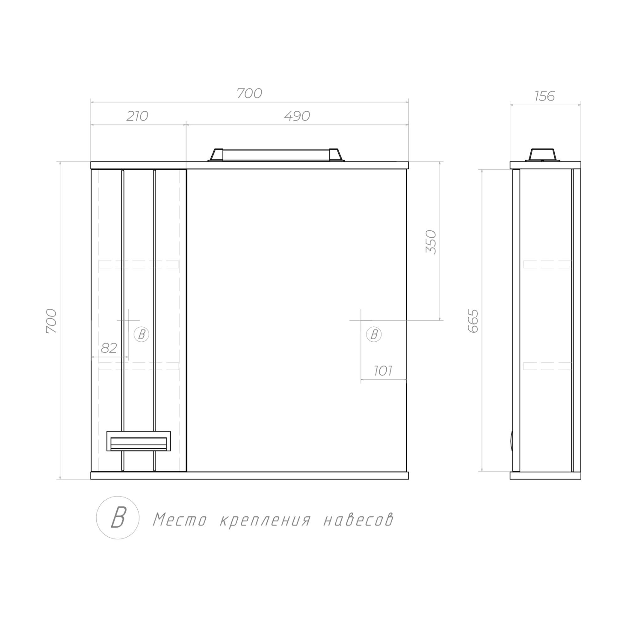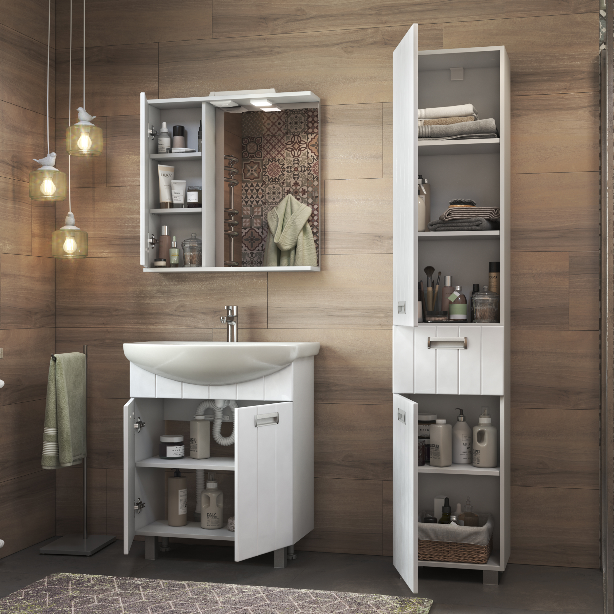1 дверца; 2 полки ЛДСП; ручка металлическая хромированная; 1 светодиодный светильник, включатель с розеткой.