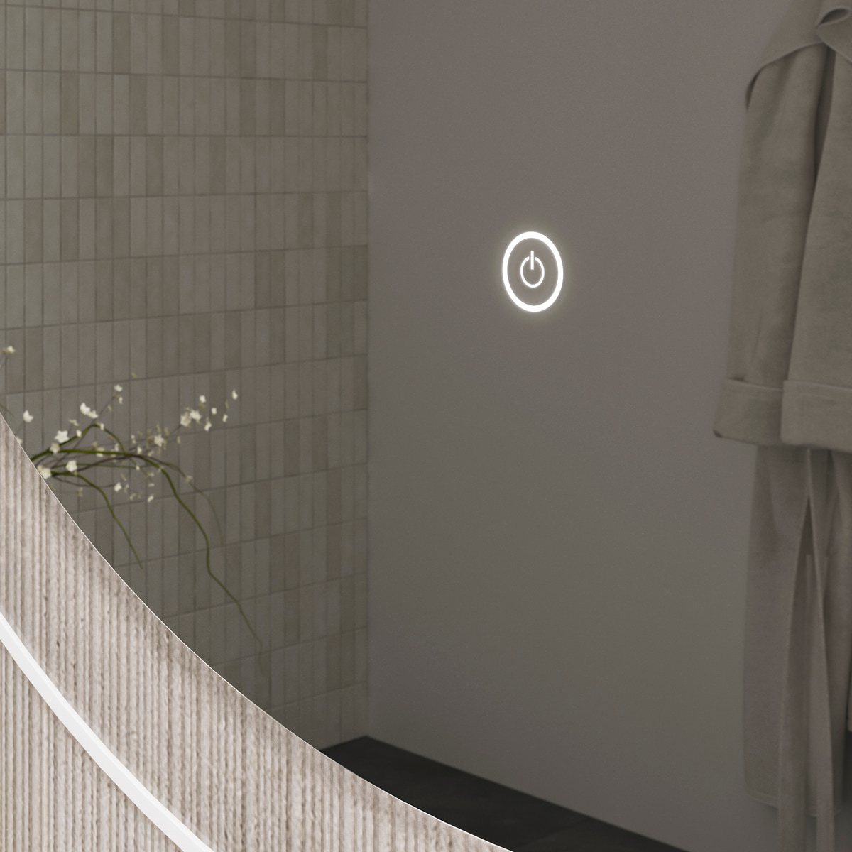 Зеркало с двойной открытой ореольной (за зеркальным полотном и за прозрачным стеклом) подсветкой «Бегущие огни». Ореольная LED-подсветка с холодной (5000К) цветовой температурой «Бегущие огни» работает за счет последовательного включения и выключения светодиодов на ленте, создавая динамические световые эффекты. Управление осуществляется через сенсор. Корпус зеркала выполнен из МДФ в пленке ПВХ в цвете Амарок.