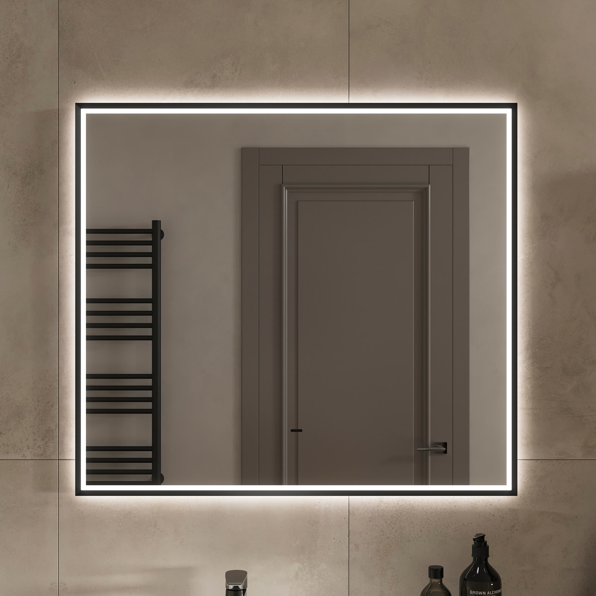 Зеркало со внутренней (фронтальной) и открытой (ореольной) LED-подсветкой, с нейтральной (4000К) цветовой температурой. Корпус зеркала сделан из алюминиевого профиля, черного цвета. Управление подсветкой осуществляется простым движением руки на расстоянии до 5 см от бесконтактного сенсора.