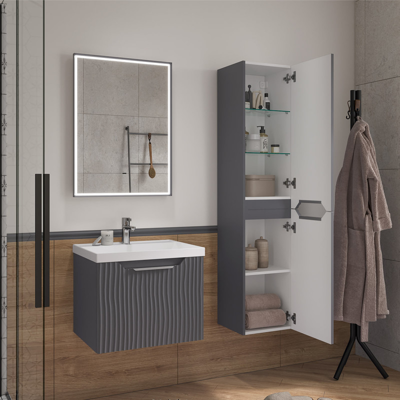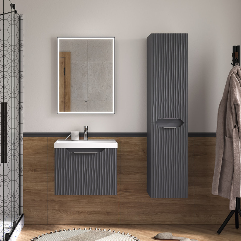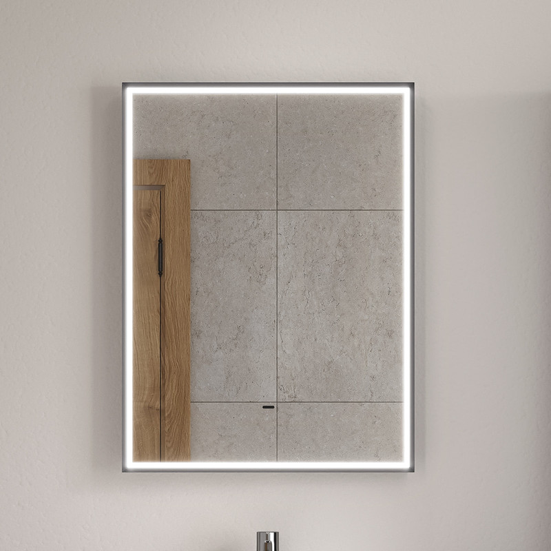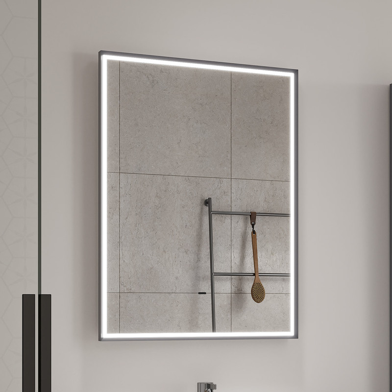 Зеркало с фронтальной LED-подсветкой в алюминиевой раме в цвете серый муар Управление подсветкой осуществляется при помощи бесконтактного сенсора.