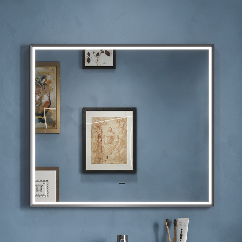 Зеркало с фронтальной LED-подсветкой в алюминиевой раме в цвете серый муар Управление подсветкой осуществляется при помощи бесконтактного сенсора.