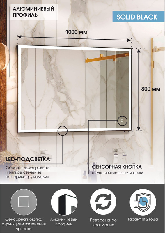 Зеркало Solid Black Led 1000x800, реверсивное крепление