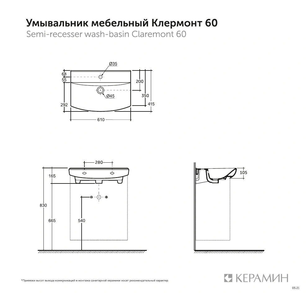 КЛЕРМОНТ Умывальник 60 с креплением, белый, CDB00029854, КЕРАМИН