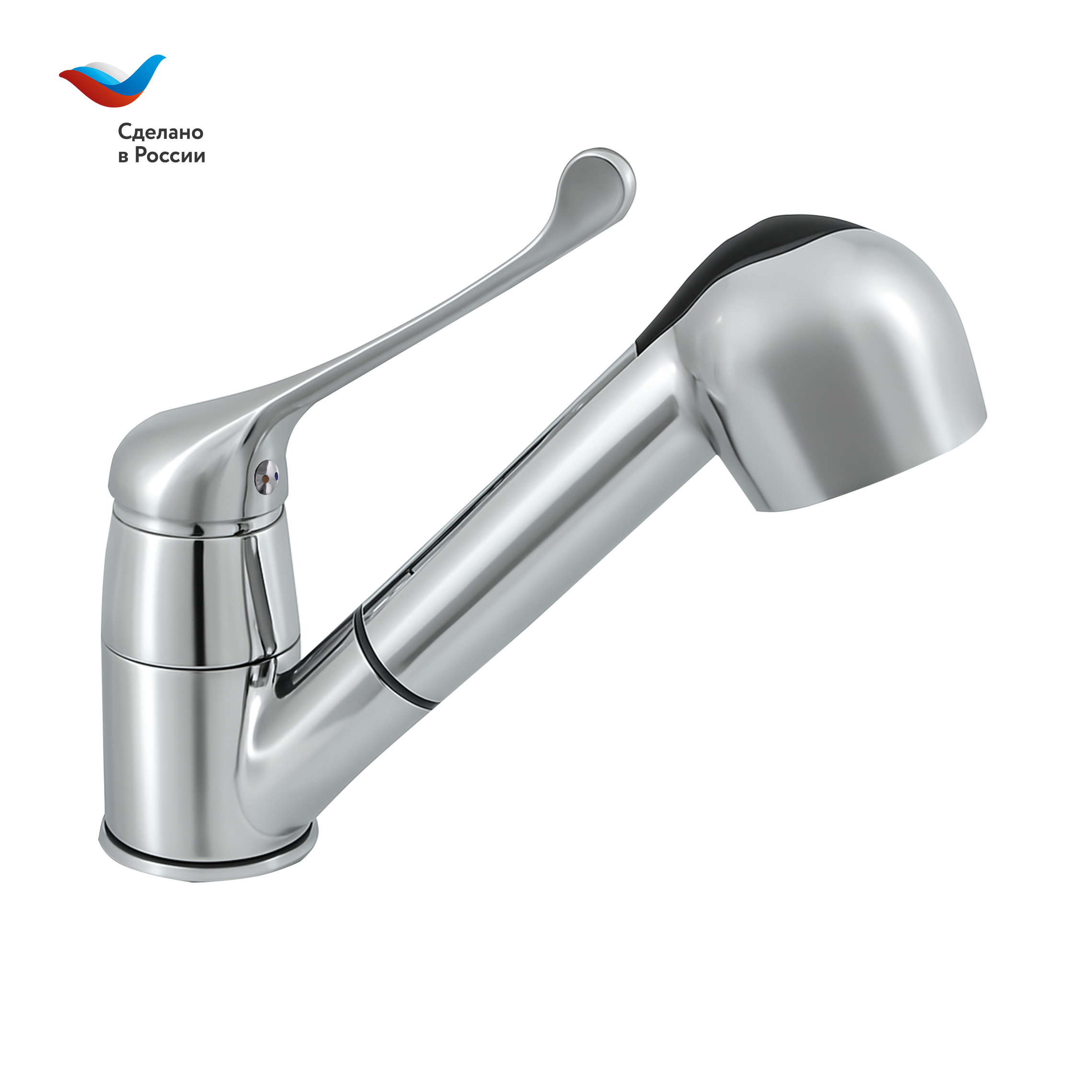 Современный однорычажный смеситель для кухни с вытяжным изливом и локтевой ручкой от компании «СЛАВЕН» c собственной сборочной линией полного цикла в Подмосковье.