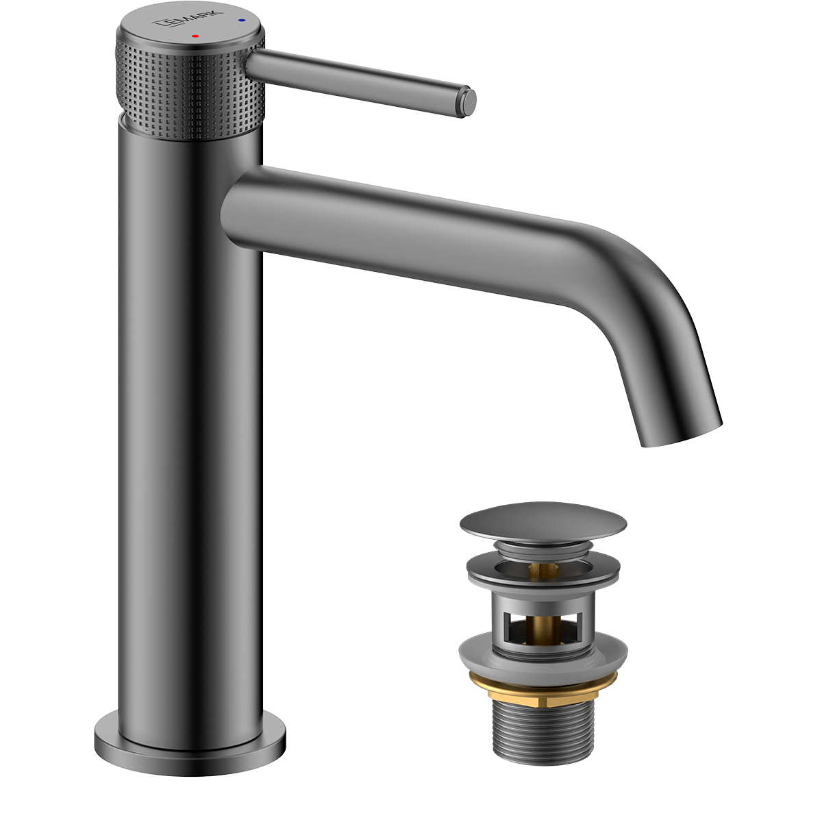 Корпус смесителя с монолитным изливом с аэратором, картриджем с керамическими пластинами и металлической рукояткой, Гибкая подводка для воды ½"-(2 шт.), Корпус донного клапана, присоединительная группа для настольного крепления