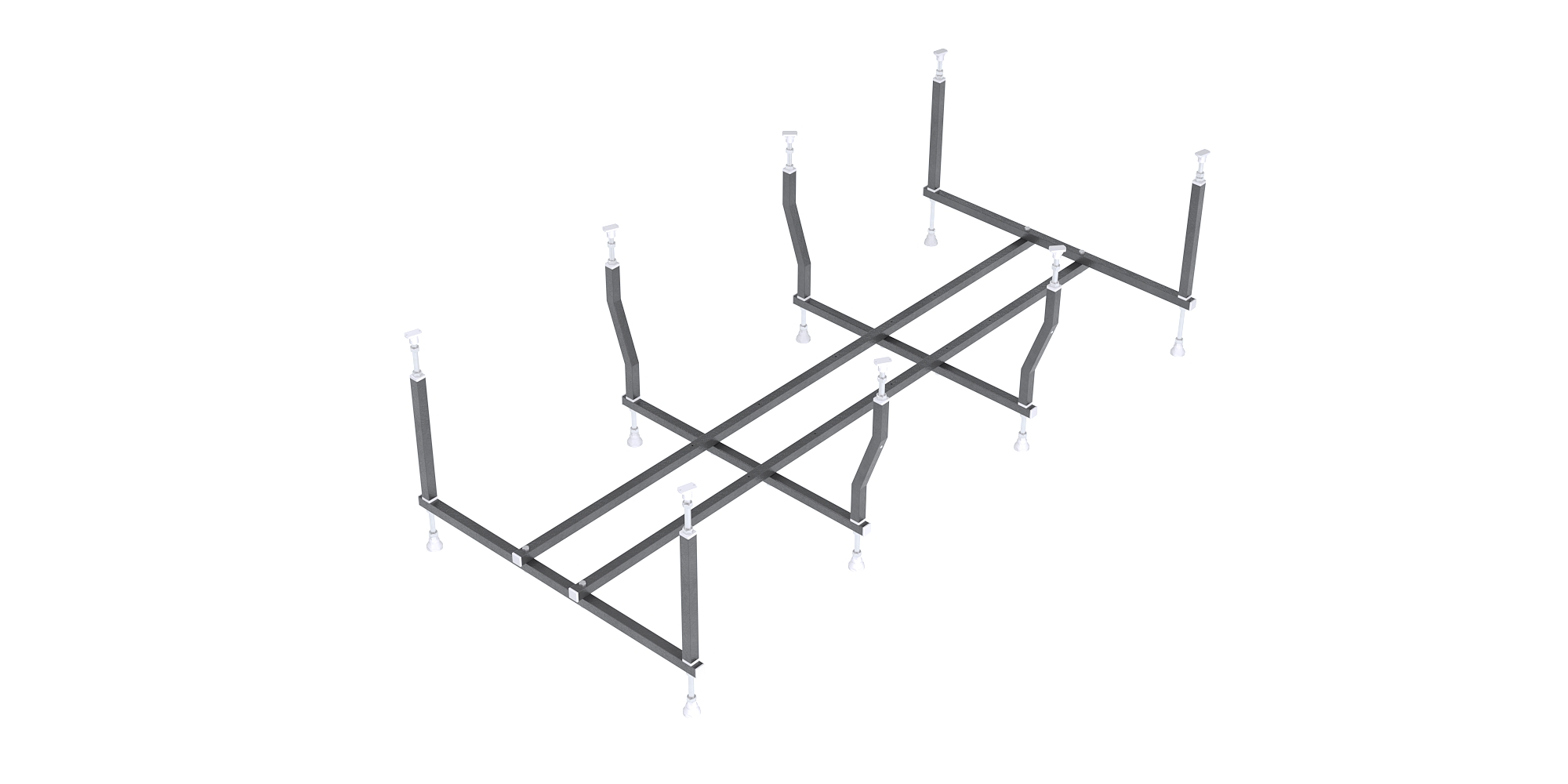 Каркас: сборно-разборная конструкция, стальной с порошковой (молотковой) покраской, с шестью регулируемыми ножками. Поставляется в комплекте с крепежом. Выдерживает нагрузку до 800 кг.