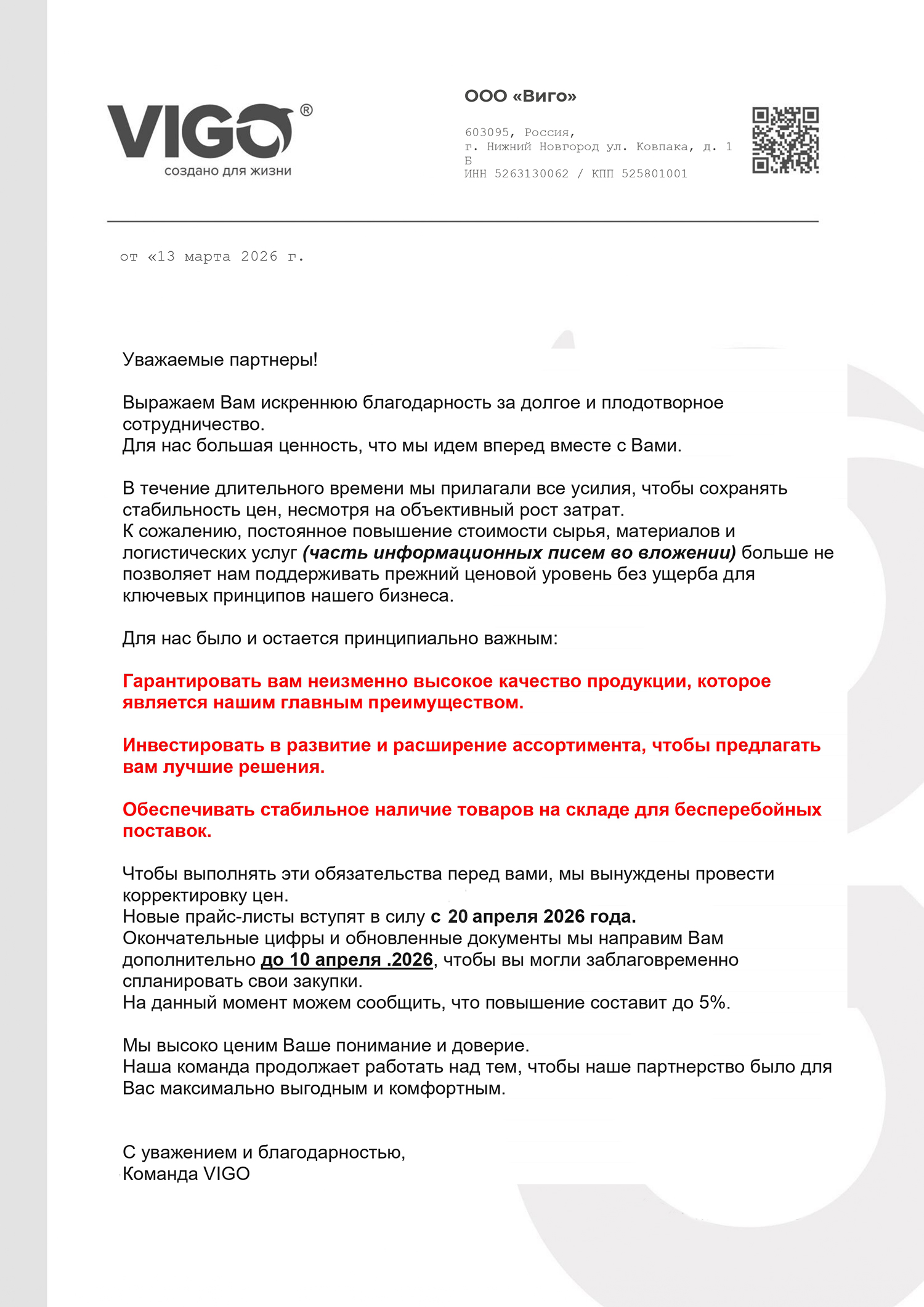 В компании ЛАВАЛЬ Вы можете заказать до 20 апреля товары VIGO и VELVEX по прежней цене.