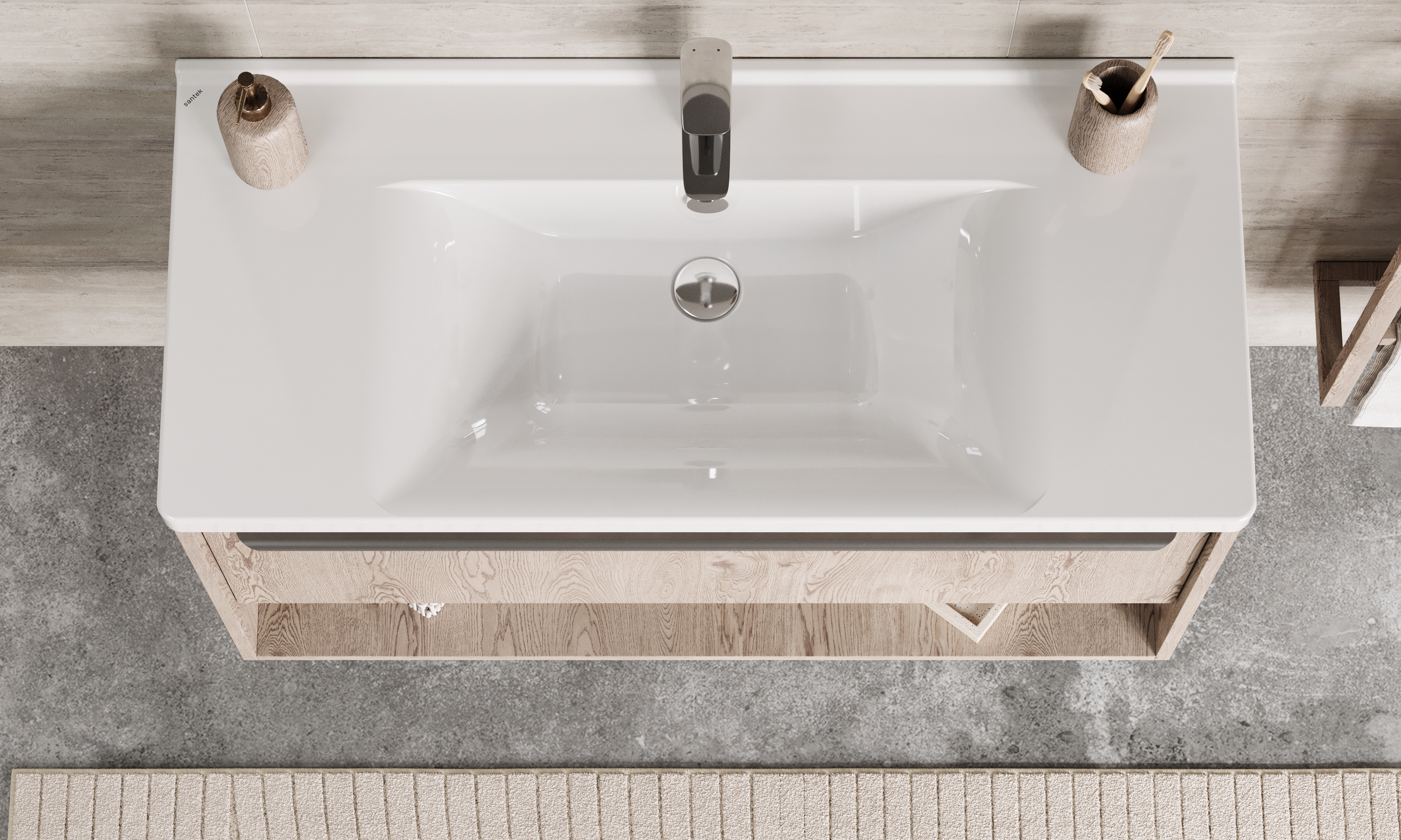 Теперь раковина Миранда доступна в размере 100 см. Широкие бортики изделия позволяют разместить различные ванные принадлежности. Глубокая удобная чаша препятствует разбрызгиванию воды. Раковина хорошо сочетается как с напольной, так и подвесной тумбой.