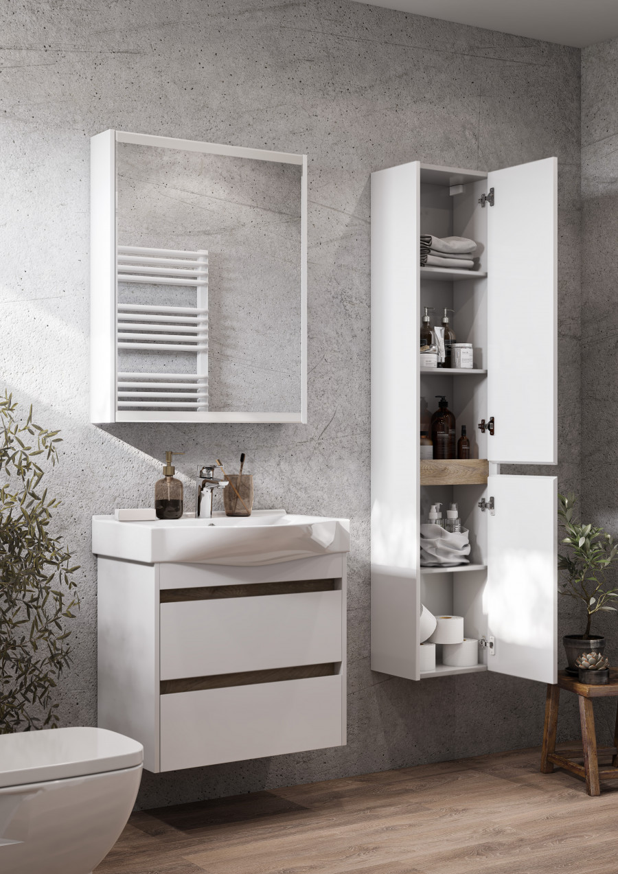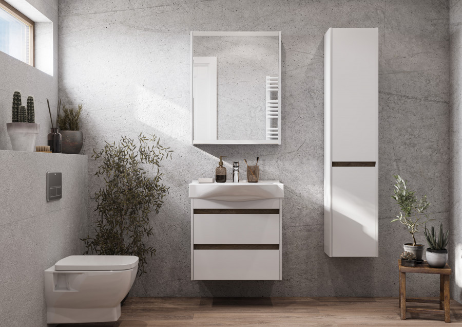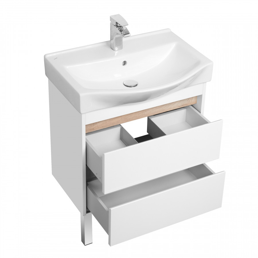 Тумба Нортон 65 в лаконичном дизайне универсальна для любого интерьера ванной комнаты. Корпус тумбы выполнен из влагостойкой ЛДСП, а фасады из МДФ в белой глянцевой покраске. Дизайн тумбы подчеркивает декоративная вставка из ЛДСП с фактурой натурального дерева дуб эндгрейн. Конструктивно тумба состоит из 2 вместительных ящиков, установленных на направляющие с доводчиками для комфортного использования. На тумбе нет выступающих деталей и фурнитуры, открытие ящиков реализовано за счет удобного выреза на фасаде. Тумба комплектуется белоснежной раковиной Беверли от бренда Santek. Тумбу можно использовать в двух вариантах: подвесную или дополнительно приобрести опоры 1A222703SI000.
